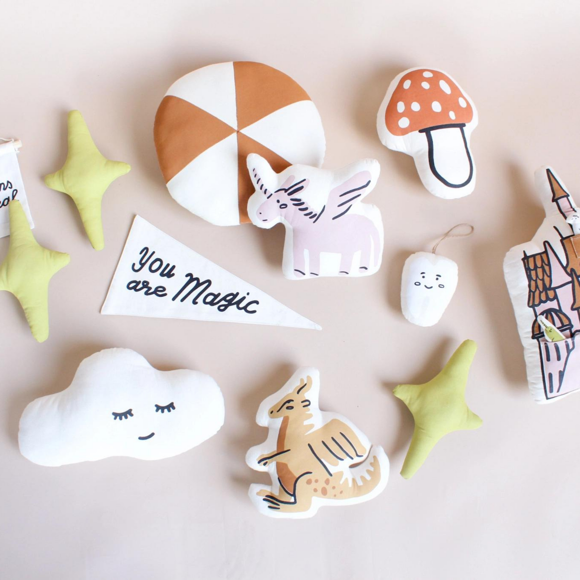 This Whimsical cloud pillow has a sleepy face. It is sewn and screen printed by hand on natural canvas by local artisans.