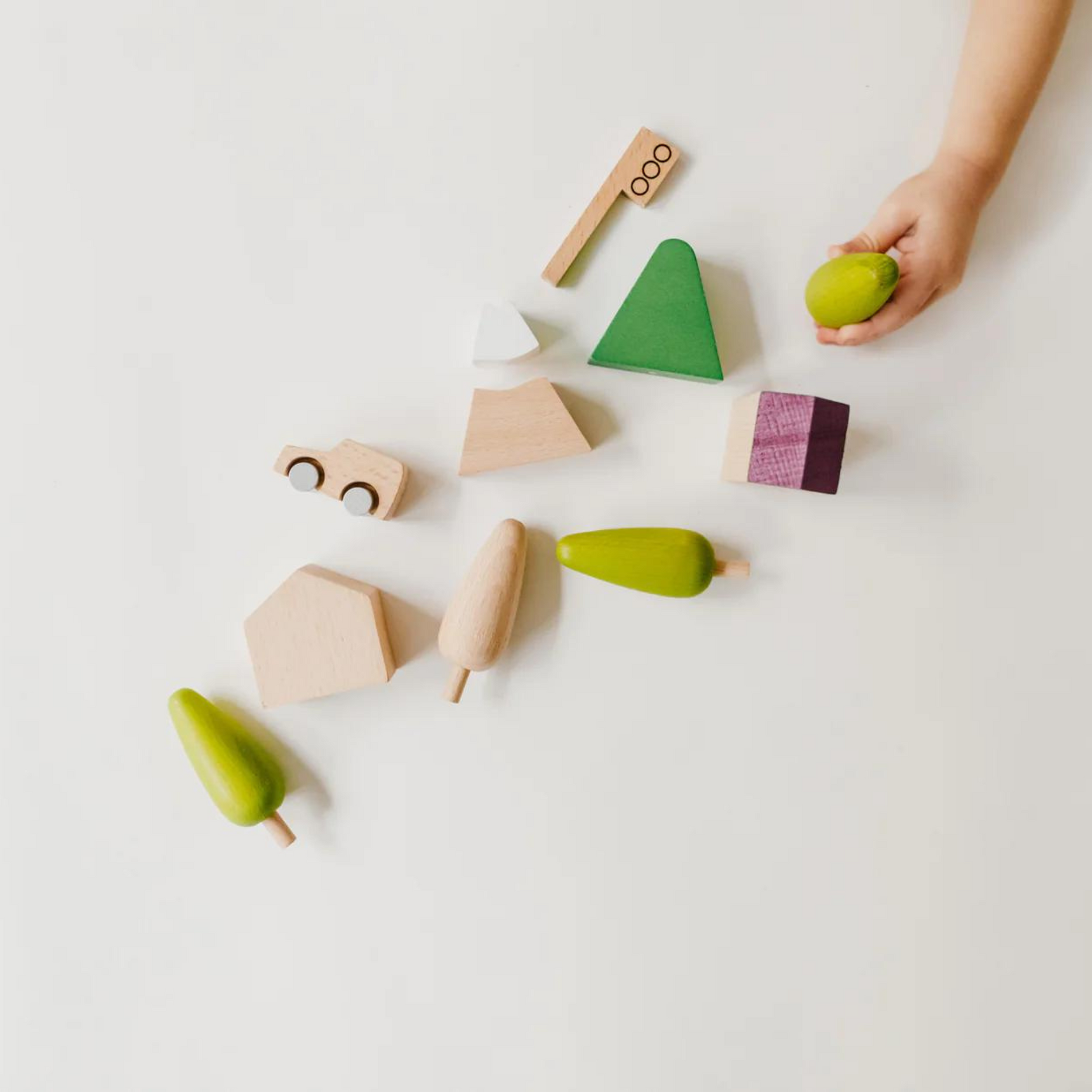 Includes 15 wooden play pieces (2 green trees, 4 natural trees, 2 traffic signals, 2 buildings, 3 green mountains, 1 Mount Fuji mountain with removable snow, 1 car), magnetic chalkboard, chalk.