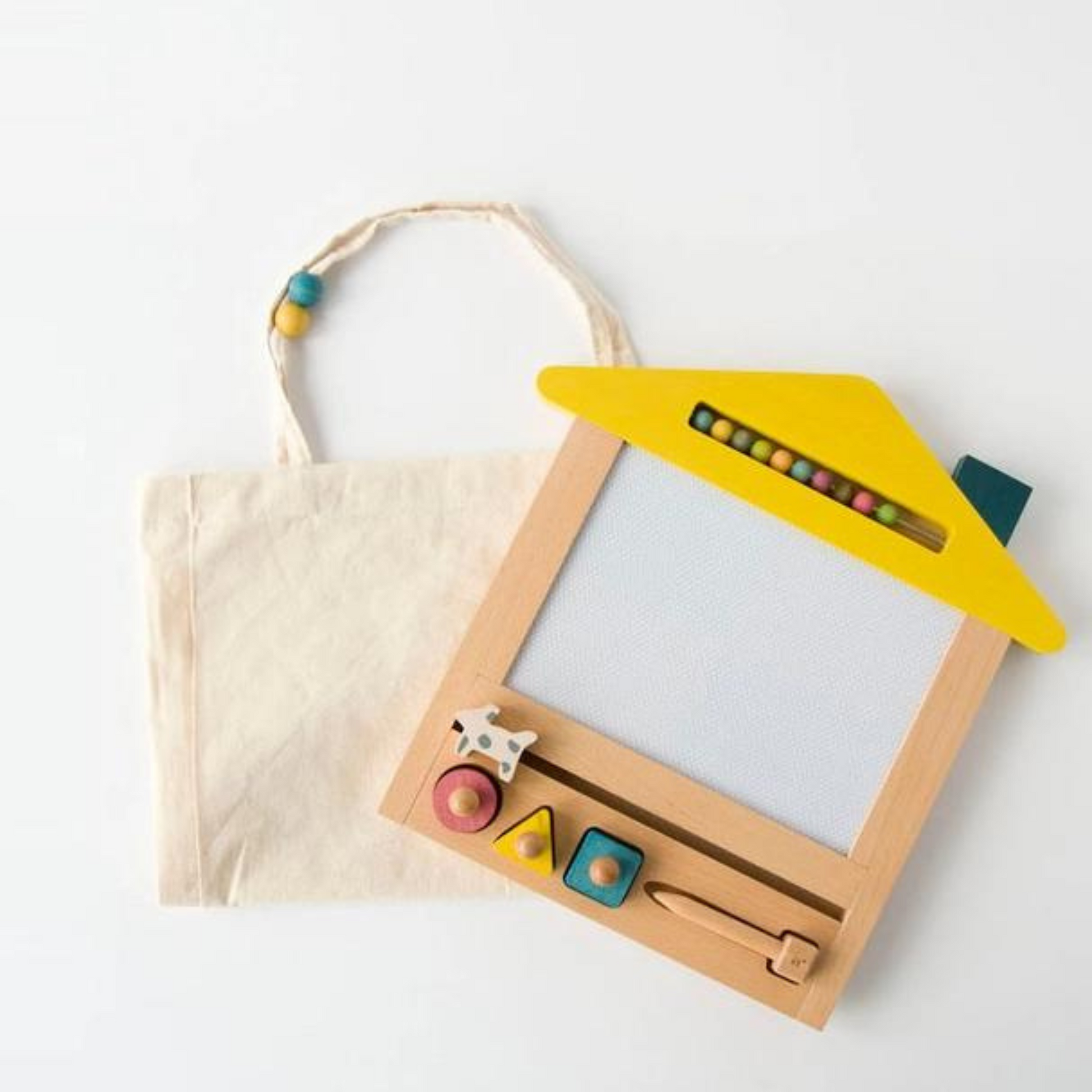 Includes house-shaped drawing board, yellow / dog model, 1 magnetic pen, 3 stamps (circle, triangle, square), cotton eco-bag for storage