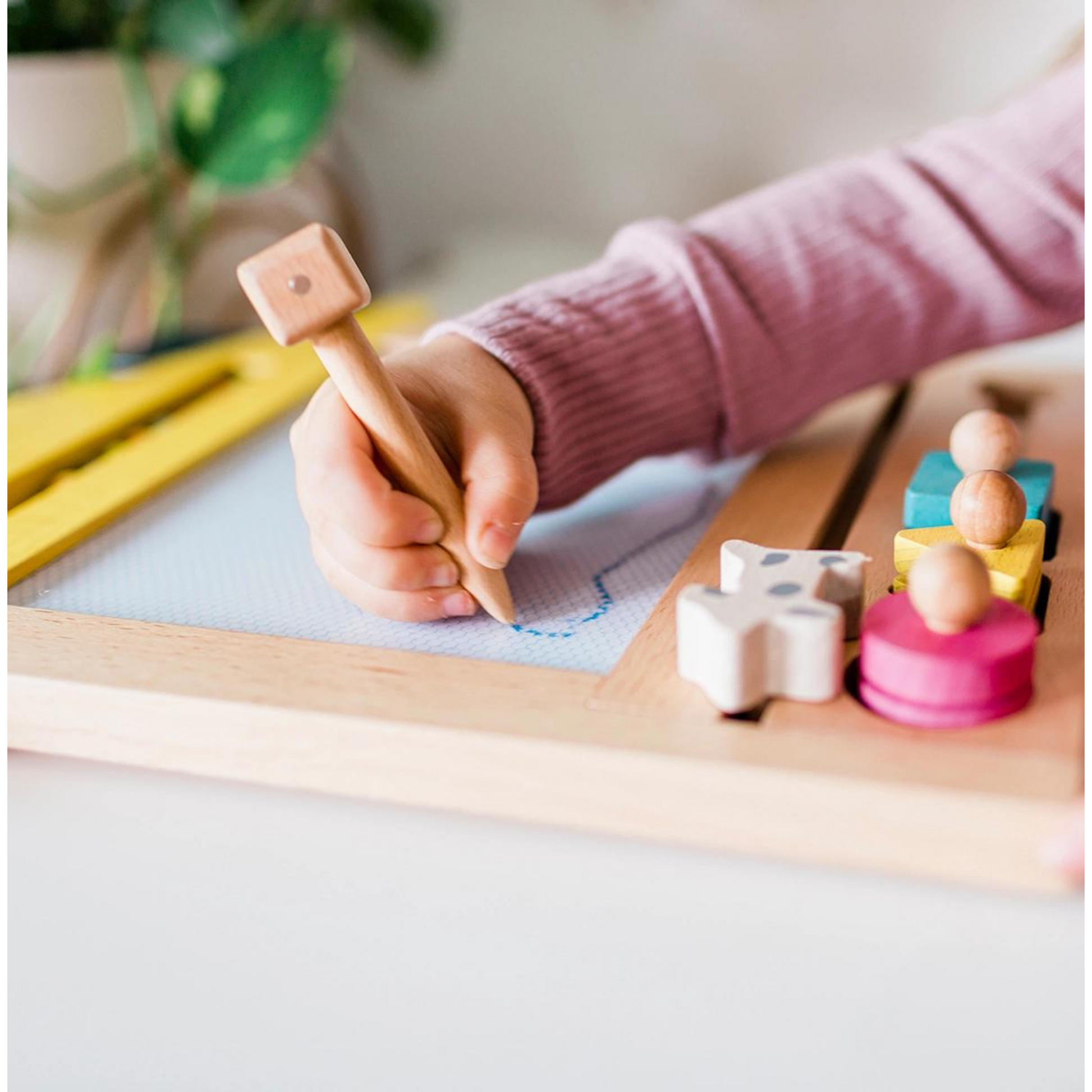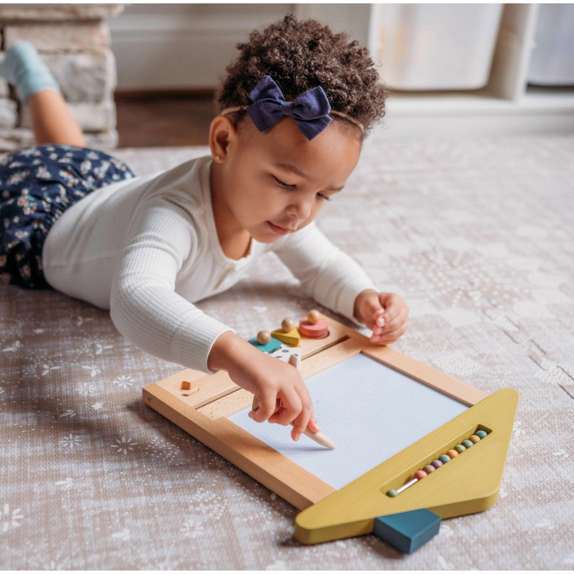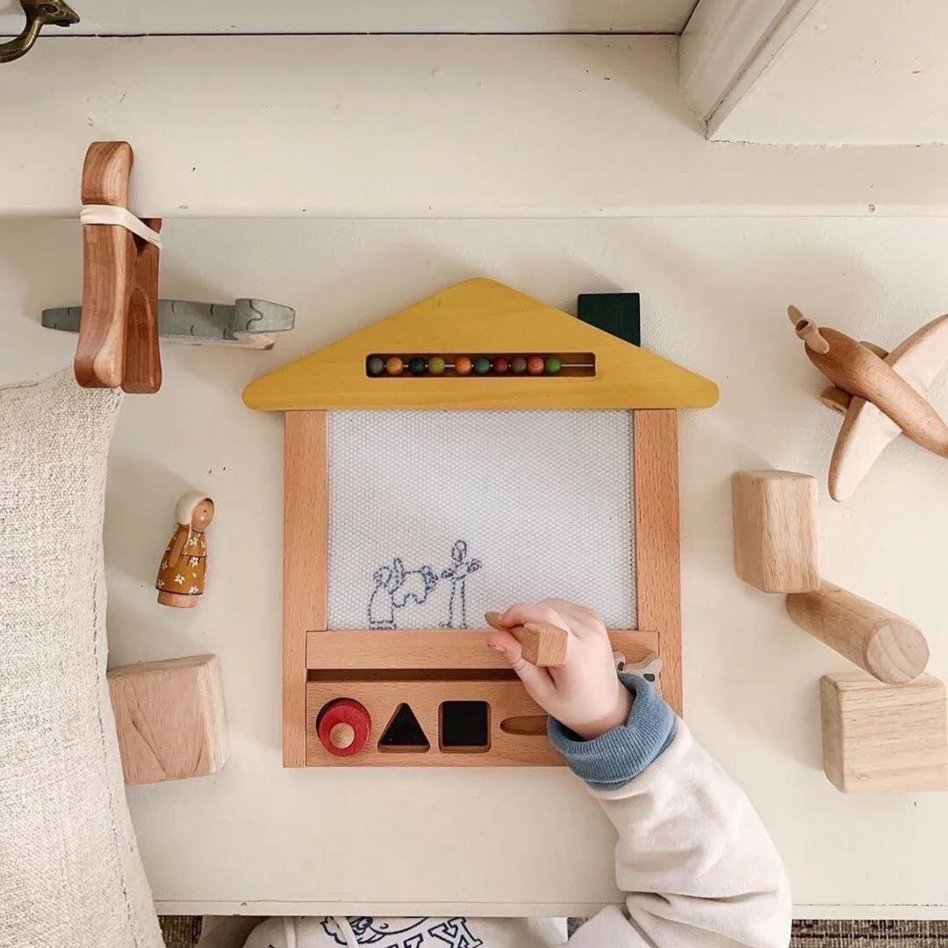 A beautifully hand-crafted wooden magnetic drawing board that's sure to become a playroom favorite. Little artists can doodle to their heart's content - with less waste and no limits. Use the ○・△・□ shaped magnetic stamps and pen to create multi-colored creations across the 4 colored magical screen. Then, slide the little dog along the board to erase and voila! Back to a clean slate again.