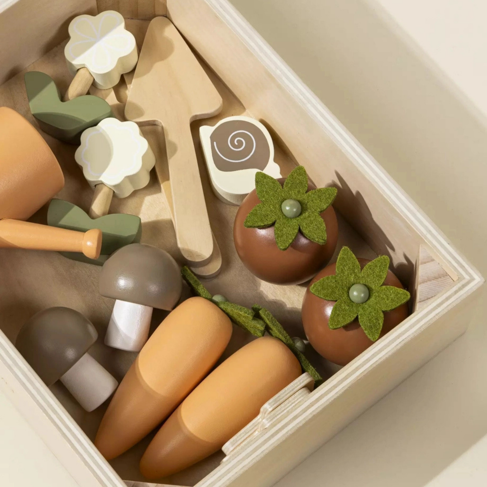 The gardening set includes: 2 flowers, 2 carrots, 2 tomatoes, 2 mushrooms, 1 snail, 2 gardening tools, 1 watering can and 3 small signs